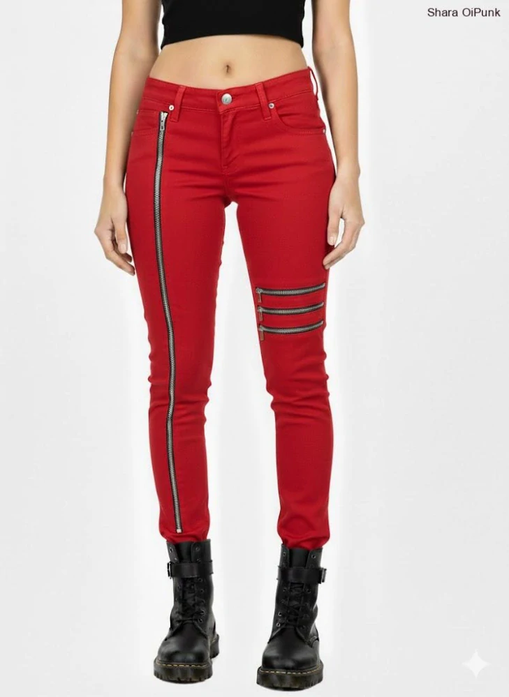 - Punk dámské kalhoty - červené se zipy