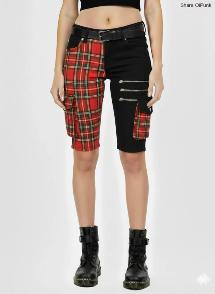 Punk kraťasy kapsáče - černá/červené káro/3 zipy