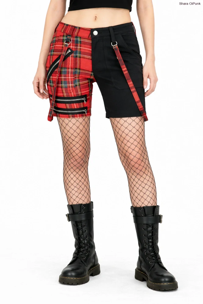 - Punk kraťasy - červené káro/černá/šle/3 zipy
