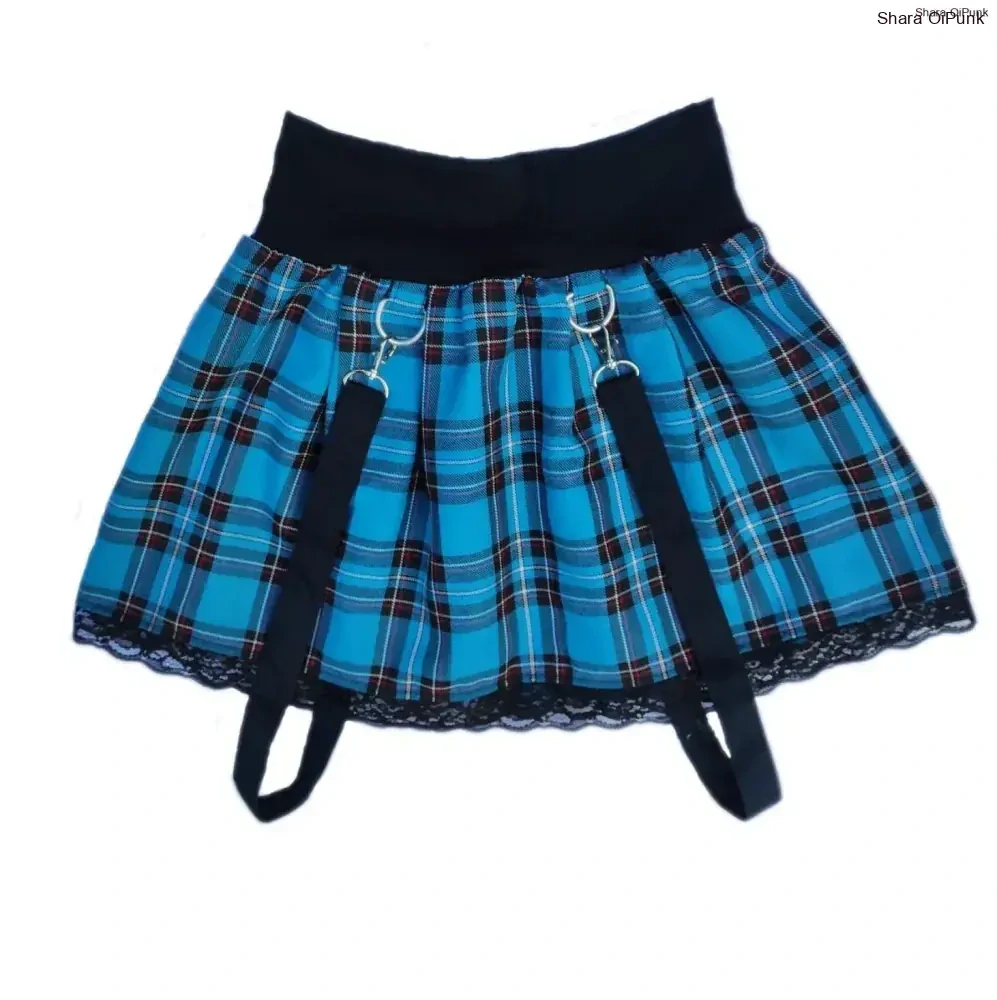 Punk sukně lehce skládaná- tyrkys káro/krajka/šle